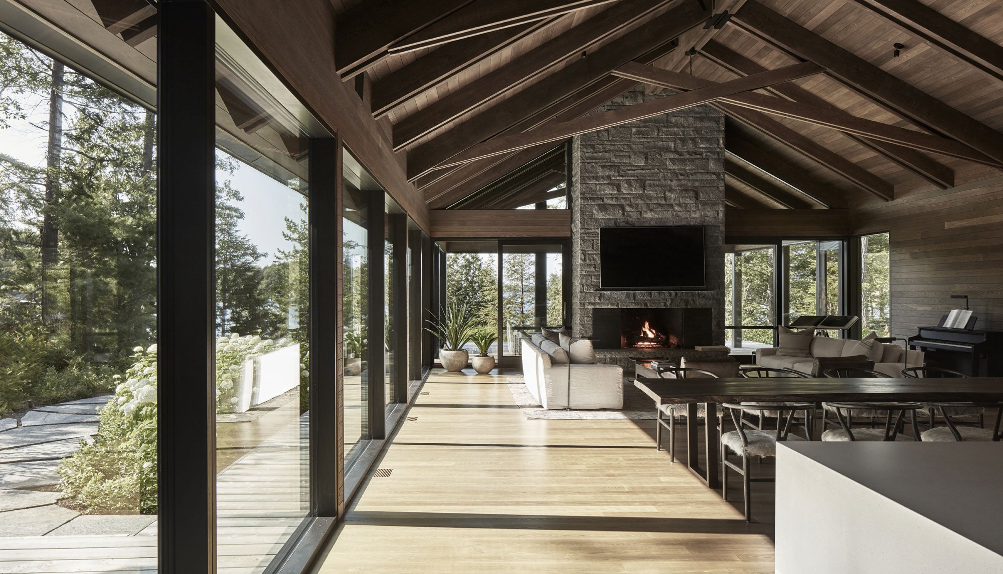 Floor to ceiling windows afford a panoramic view of the lake and woods outside.