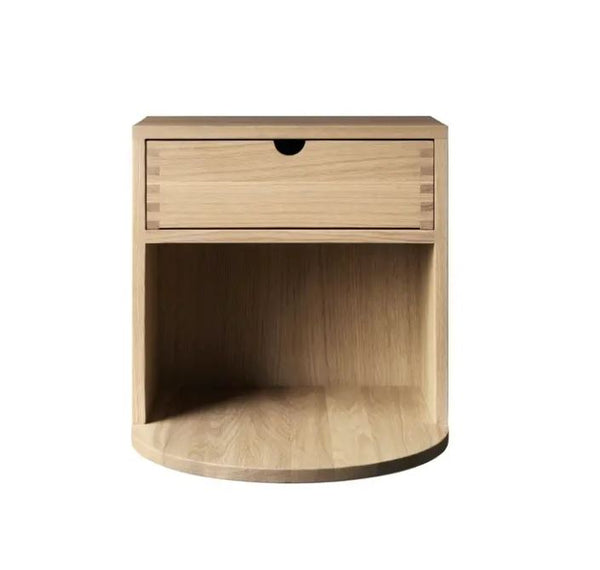 The Radius bench, which is one of the significant innovetions in FDB Møbler's new era, now has a little brother. Radius The Wall Cabinet hangs on the wall, where the semi-circular shelf signals its kinship with the bench and adds a soft and organic feeling with the matt lacquered oak. Like the bench, it also has a drawer with tap joints that emphasize the solid craftsmanship and material. A beautiful piece of furniture to wake up to in the bedroom, where it helps give the room a light, airy feel by hanging on the wall. The table will do any room justice, be it the hallway, living room or other places where you need to put small things away and where there is just enough space for a small table with a great radiance of Danish design and Nordic quality.