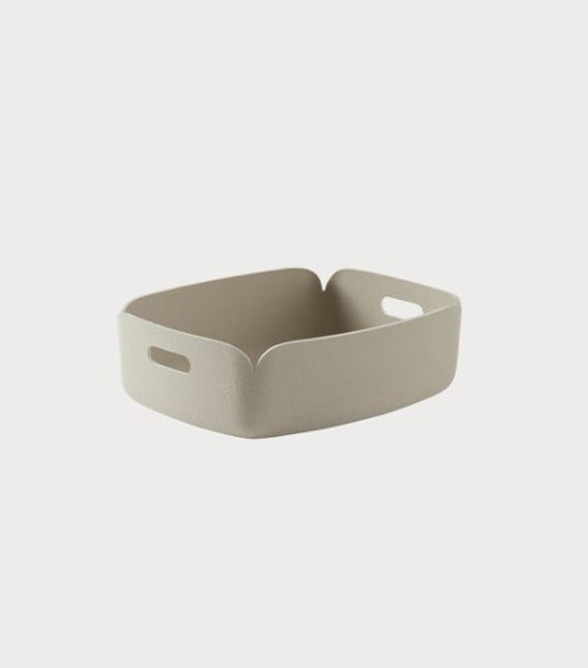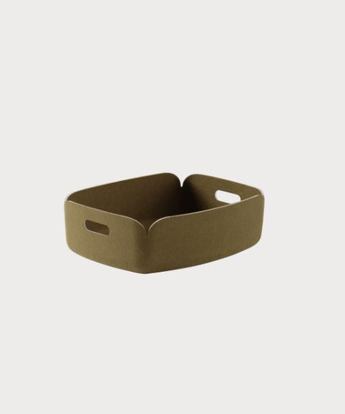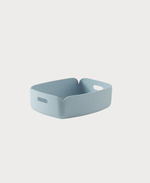 The iconic RESTORE basket has been expanded further into two exciting and functional new size options; the RESTORE TRAY and the RESTORE ROUND basket. Both of the new sizes are made of the same long lasting and durable polymer felt composite as the original RESTORE and are versatile enough to be used in a variety of different ways. The RESTORE TRAY can be used for all sorts of papers, objects and enables this cool Muuto classic to be added to your desk space and shelving. The small size fits perfectly in many different places!The baskets are mainly made from fibers extracted from recycled plastic bottles.